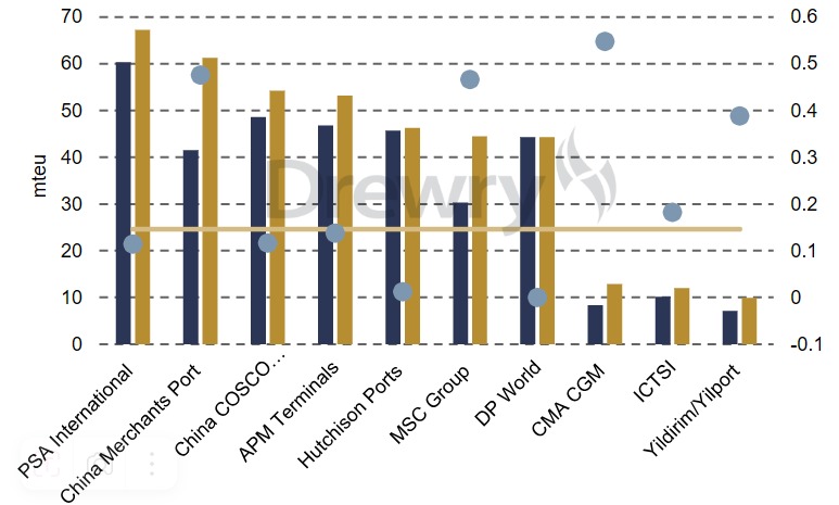 Терминальные подразделения ряда ведущих мировых судоходных линий, таких как MSC Group (TiL и AGL), CMA CGM (CMA Terminals и Terminal Link) и, совсем недавно, Hapag-Lloyd (Hanseatic Global Terminals), которых Drewry обозначила как гибридных операторов терминалов, укрепили свои позиции в рейтингах компании. Эти бизнес-единицы, на 100% или в основном принадлежащие указанным контейнерным перевозчикам, в основном работают на терминалах на тех же коммерческих условиях, что и ведущие независимые операторы (PSA International, China Merchants, DP World, Hutchison Ports), но лучше гарантируют объемы благодаря совпадению собственности.